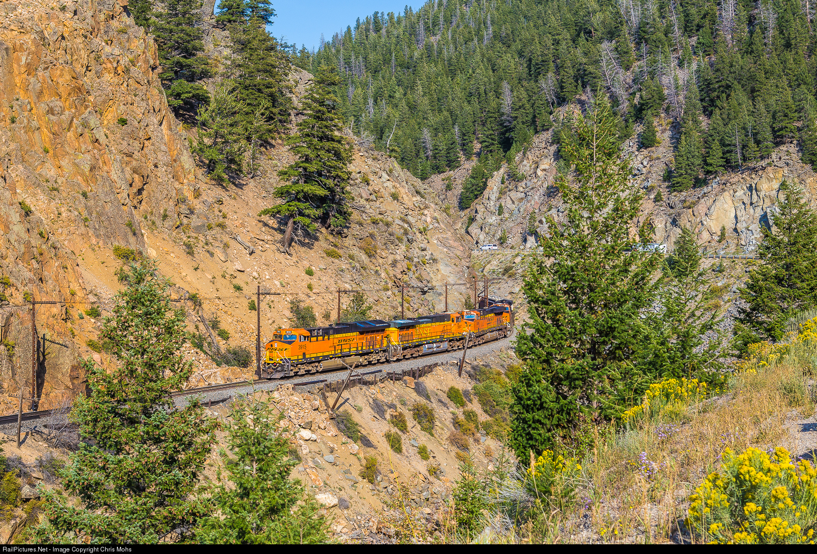 Pulling westbound BNSF No. 3915 winds through Byers Canyon in the Rocky Mountain High Country.