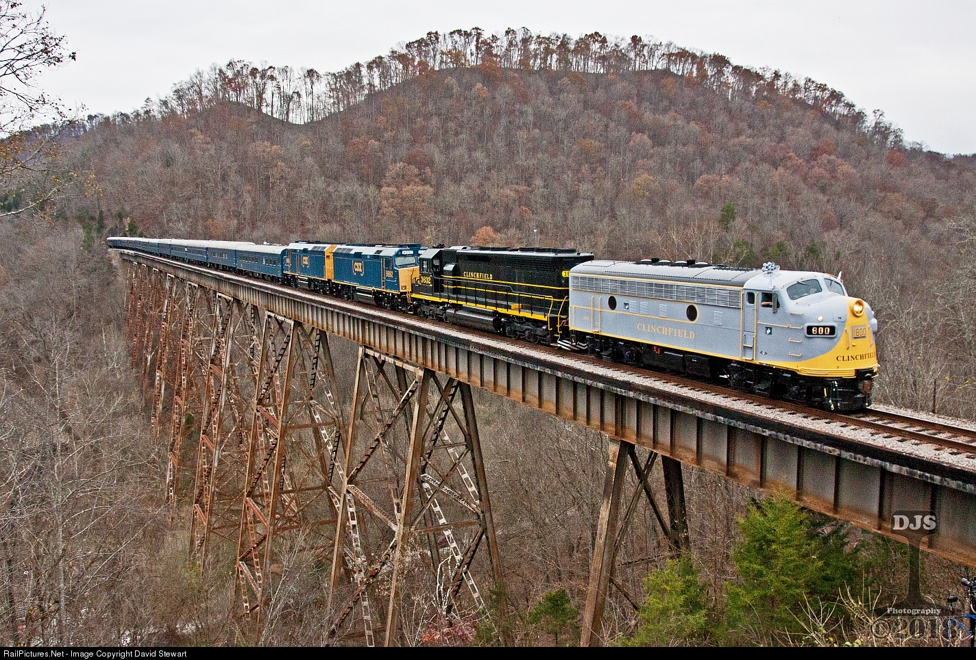 | The original Clinchfield F3 800 came out in magnificent form prior to the running 9f CSX's 75th annual Santa Train. There were many people behind the scenes that made this an epic event and even though it was cloudy, that didn't matter. As far as I was concerned personally overcast conditions just made the intense traveling between photo locations less stressful. The last "big shot" for the day's historic journey for most people was at Copper Creek Viaduct in Clinchport, Virginia seen in this view. |