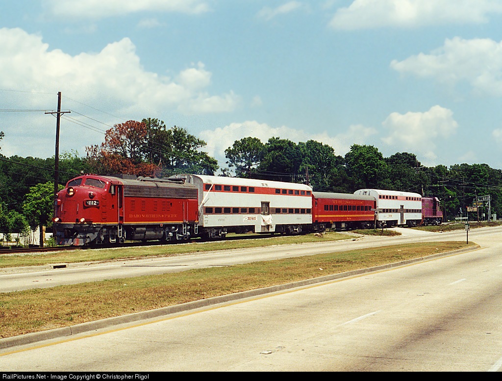 The second to last day of operations for the "Big Easy Steam Train" was missing the Steam Locomotive! Pulling north bound is Idaho Northern & Pacific F10. The two bi-level cars Pullmans originaly owned by C&NW.