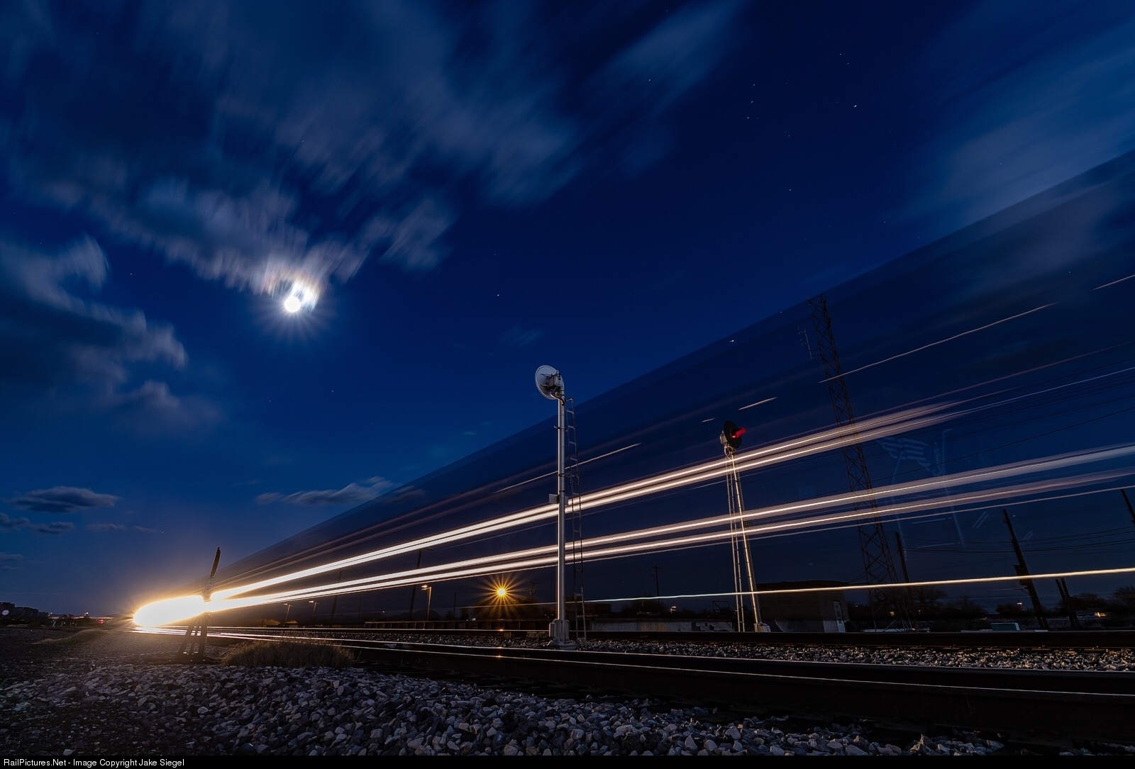 | A new EMD locomotive charges through the soon to be gone remaining searchlight Signals on the UP Sunset Route. The night has only just begun in this photo and the full moon will soon dance with the clouds. |