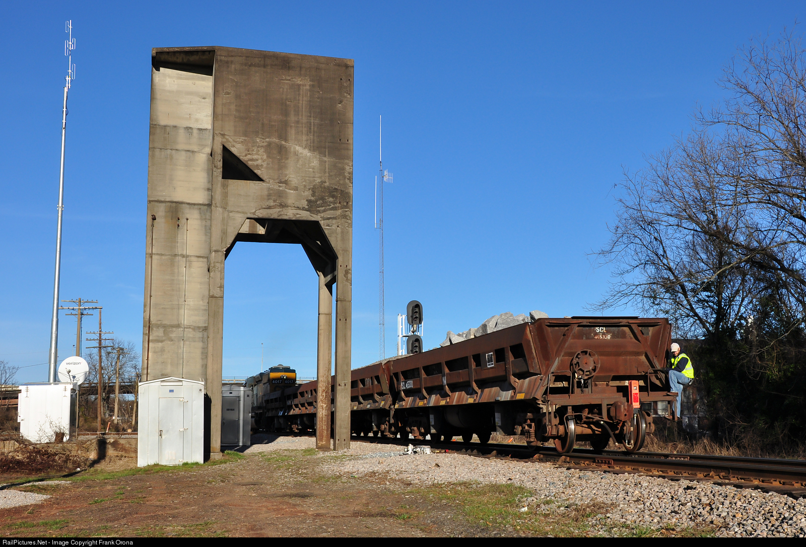 | Holding onto what little grab irons there are on a Difco dump gondola, the conductor of A746 keeps a 3 point stance as he rides the shove maneuver to place these gons or riprap into the Opelika siding for a runaround move. The lone engine of A746 will then take these cars south back to Notasulga as they complete their day of work. Of note is the new PTC antenna and CTC signal boxes along with a Verizon dish that have joined the veteran Western Railway of Alabama coaling tower at the Opelika interlocking. |