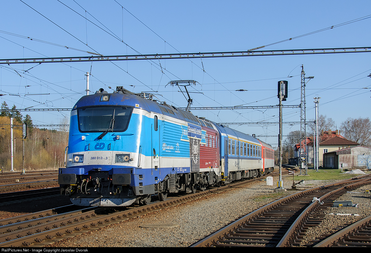 | CZ / 196 Linz - Ceske Budejovice - Praha (Ex 154 JIZNI EXPRES). On the occasion of the 80th anniversary of the anniversary, the Slovak Railways acquired one of the 380 series locomotives, which also runs on the Prague - Bratislava route, an extraordinary annual paint with the visualization of the legendary motor express. |