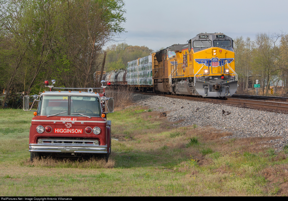 A recently repainted UP AC44CW leads a Northbound manifest past the Higginson fire truck engine #2