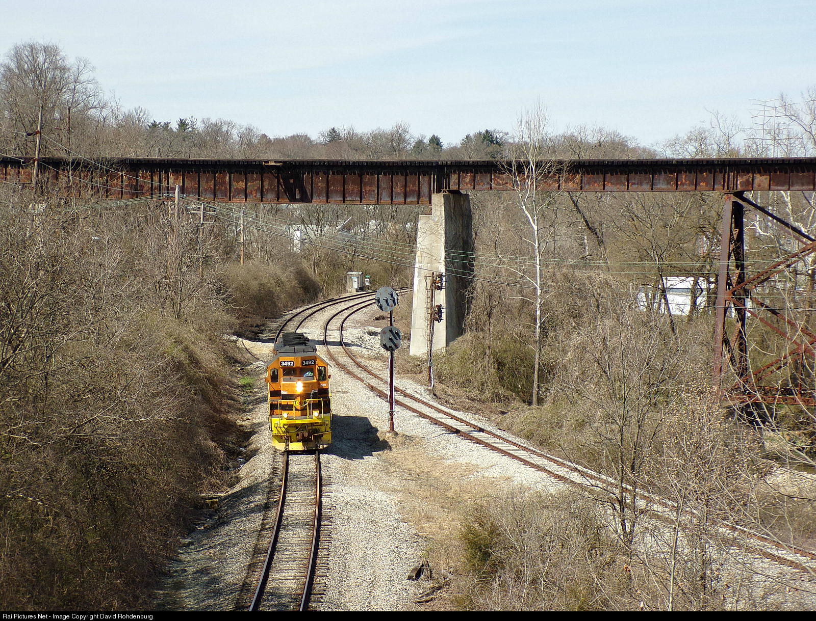 | I&O SD40-2 3492 rolls through the junction of the I&O (PRR) Oasis Subdivision and the NS (N&W) Cincinnati District at VALLEY in Fairfax, heading engine lite to do some switching in nearby Undercliff Yard. The abandoned former N&W Hyde Park Branch used the large trestle overhead, soon to be a part of a new rail trail. |