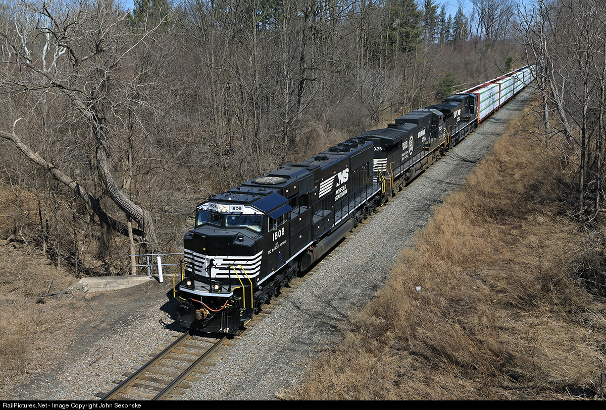 A recent NS Progress Rail rebuild leads a 62 car Montreal to Binghamton mixed freight up the grade out of the Mohawk Valley at the Princetown Rd. overpass in South Schenectady. The 1808 is trailed by NS 9250 in OLS paint and