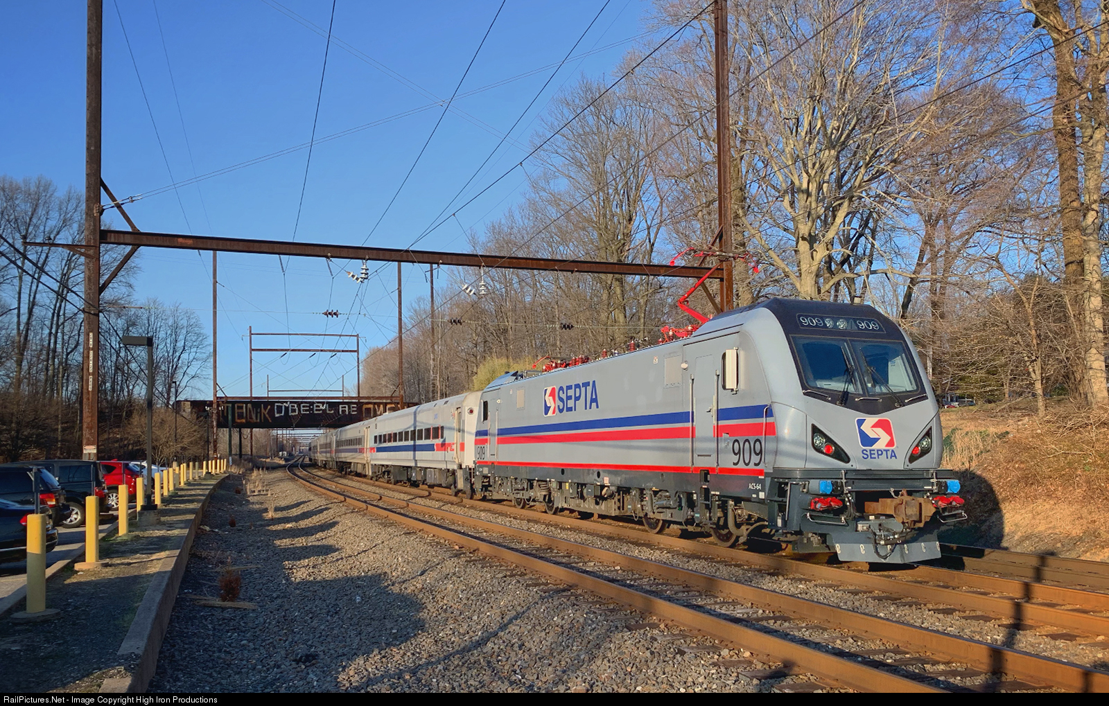 | One of two outbound push/pull sets to operate on SEPTA's West Trenton Line accelerates out of Woodbourne station, with ACS-64 #909 shoving. |