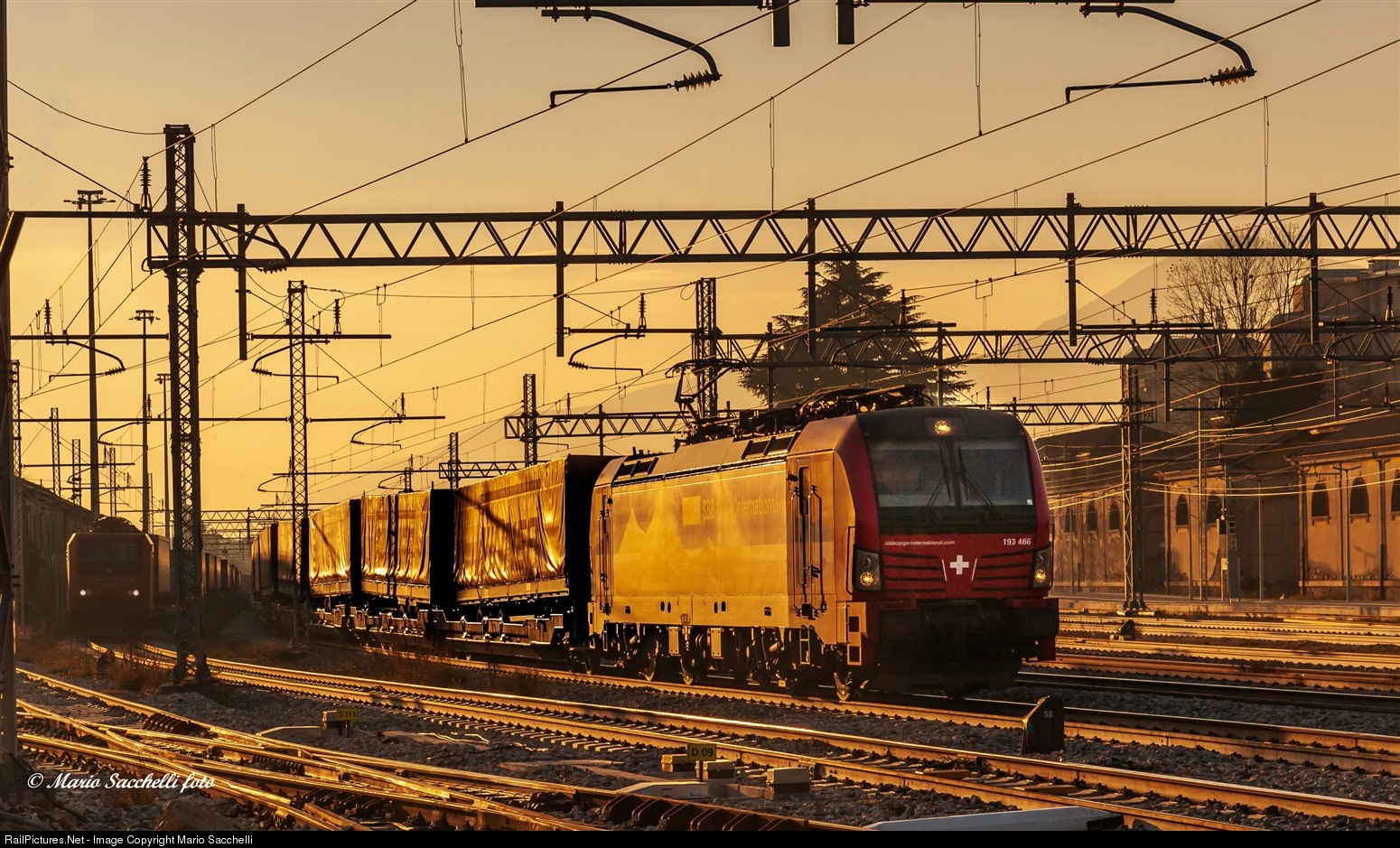 | La Vectron 193-466 di Sbb Cargo, pronta a partire da Luino con il Winner Zug, con un sole invernale verso il tramonto. |