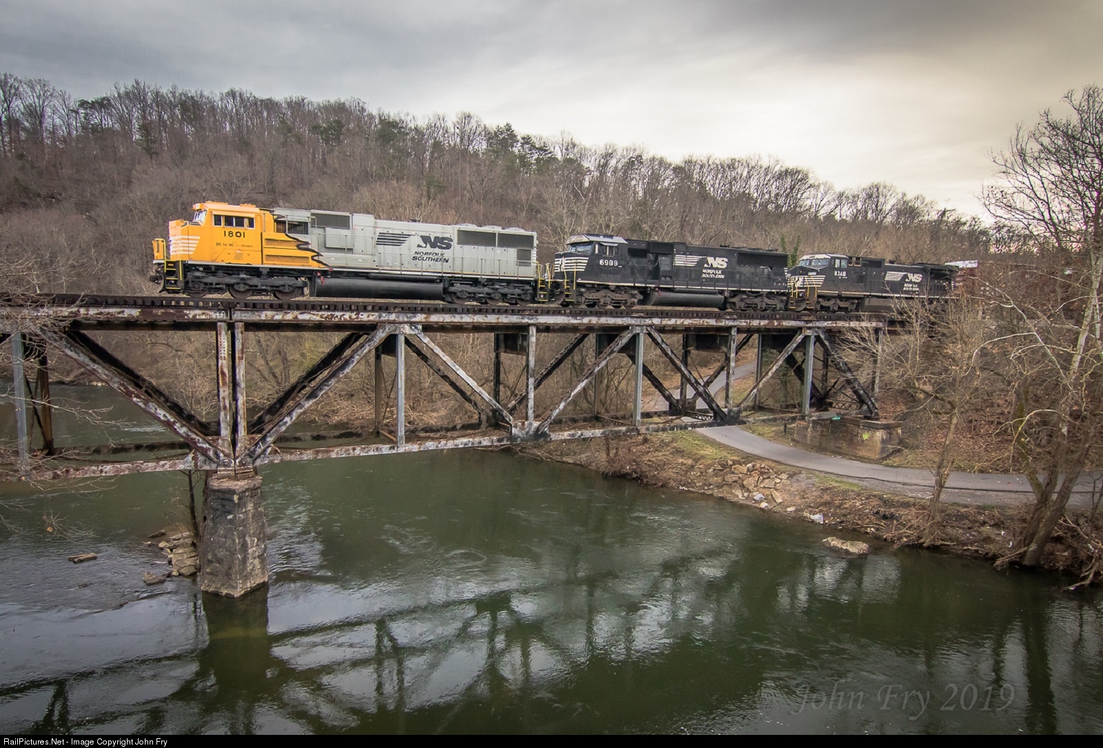 One of NS's newest DC to AC conversion crosses the Pigeon river on an overcast January 17th morning as it heads into Newport, TN on its way from Asheville, NC to Knoxville, TN.