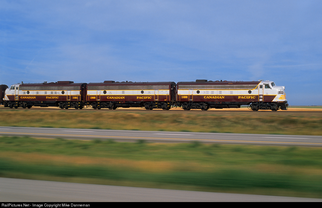 Flying eastbound on the Crowsnest Subdivision east of Fort Macleod, Alberta, is Canadian Pacific’s Royal Canadian Pacific luxury train on September 15, 2002. Dashing the train toward Lethbridge is a A-B-A set of covered wagons led by FP7 No. 1400, F9B No. 1900, and a former CN FP9 now numbered No. 1401.