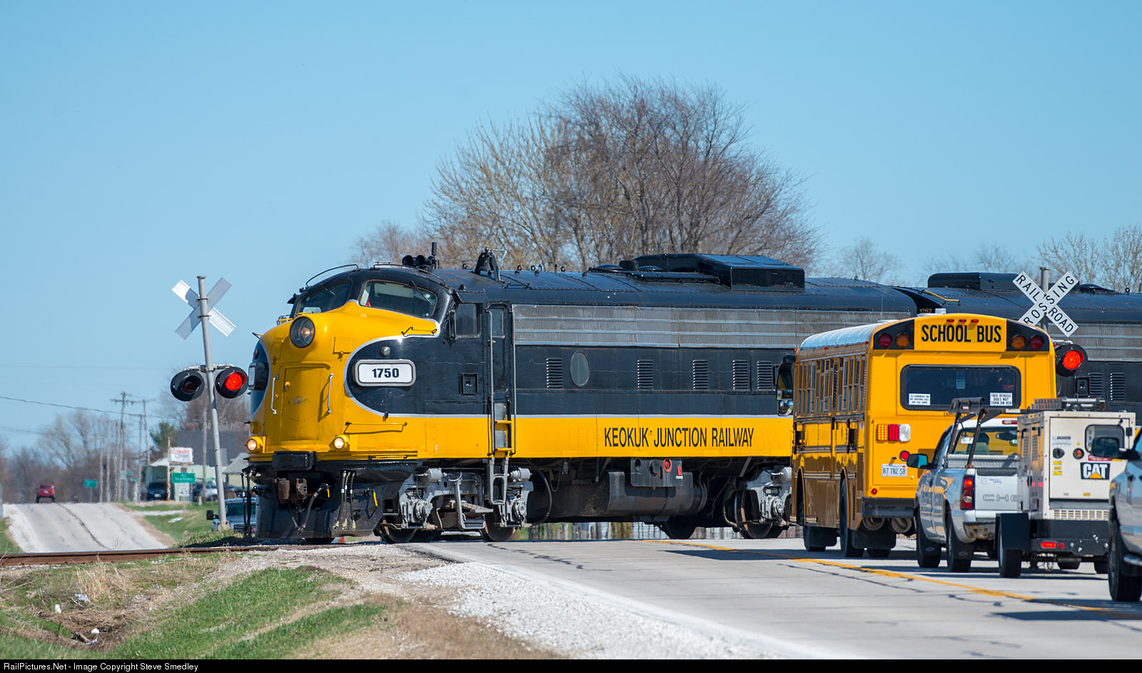 Keokuk Junction Railway 1750 West crosses Illinois State Route 95 at New Philadelphia, Illinois on Tuesday, 9 April 2019. With the B unit out of the A-B-A set for service, the two Aunits, both FP9A's and GP20 2003 make up the power set this day, although 1752 is not running and 1750 has just died, leaving the former Santa Fe GP20 doing all the work.