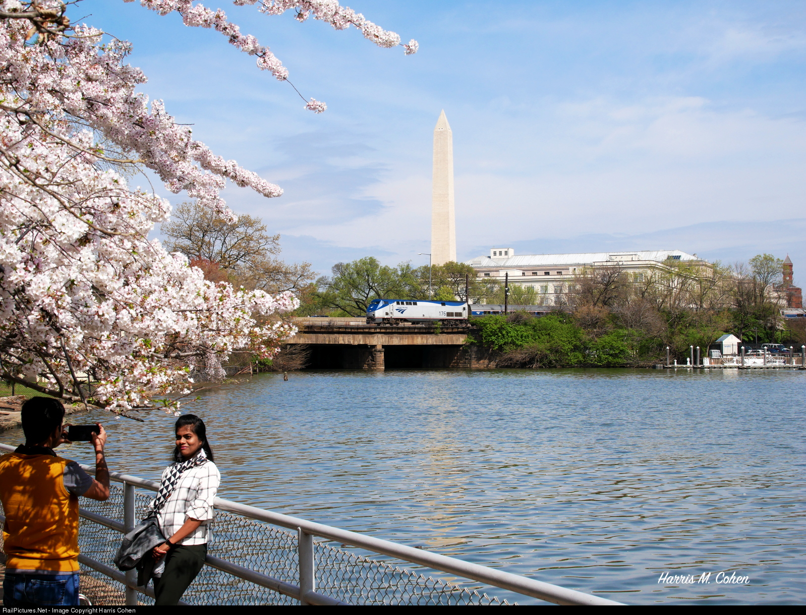 On a gorgeous spring day with the cherry blossoms in peak bloom at the tidal basin, Amtrak Cardinal Train #51 heads west as a couple taking a photo gets an unexpected surprise with Amtrak in the background.
