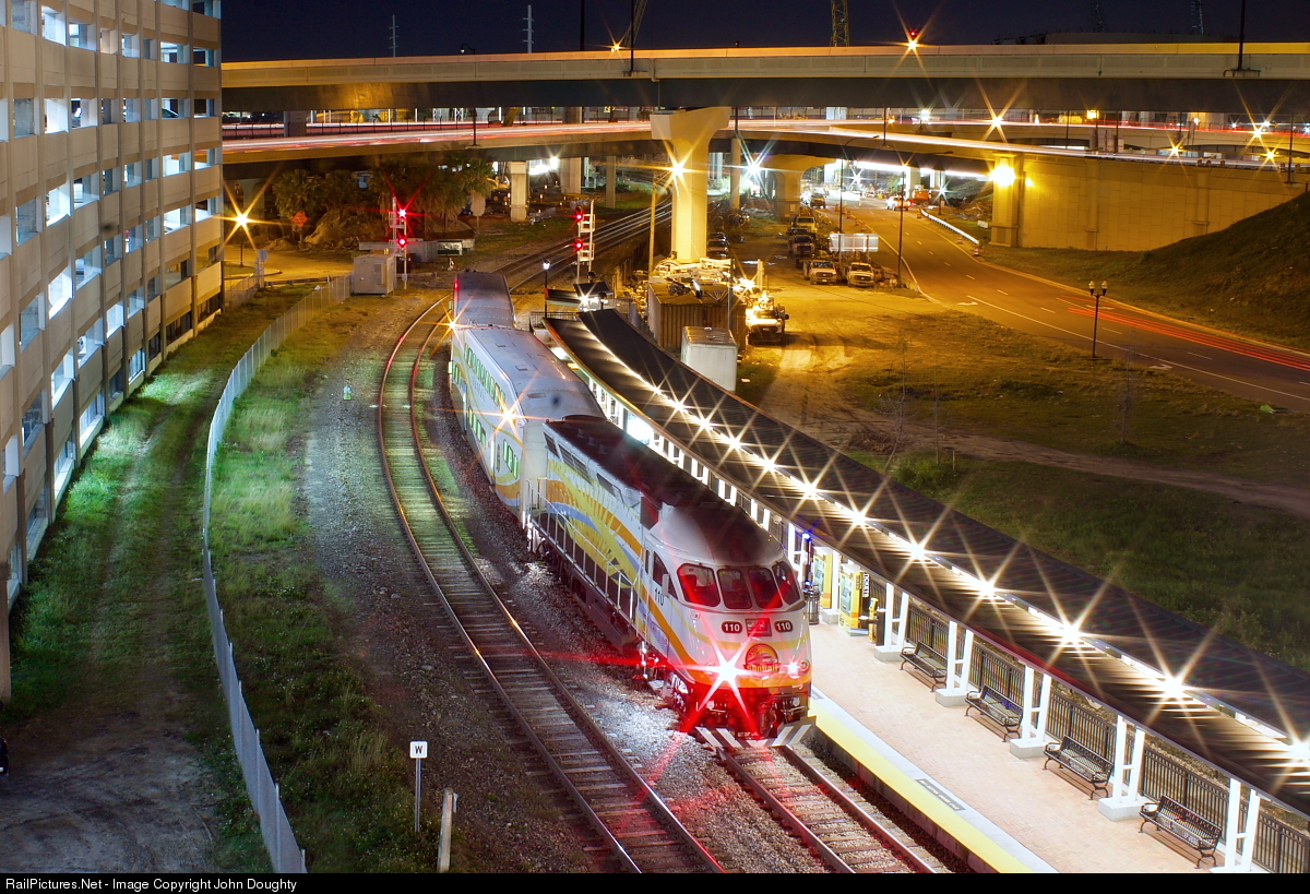 | Sunrail train P340 has stopped at the Church Street Station to pick up passengers after the Orlando Magic basketball game. Construction continues throughout the downtown Orlando area, which makes riding the Sunrail train a good option. |