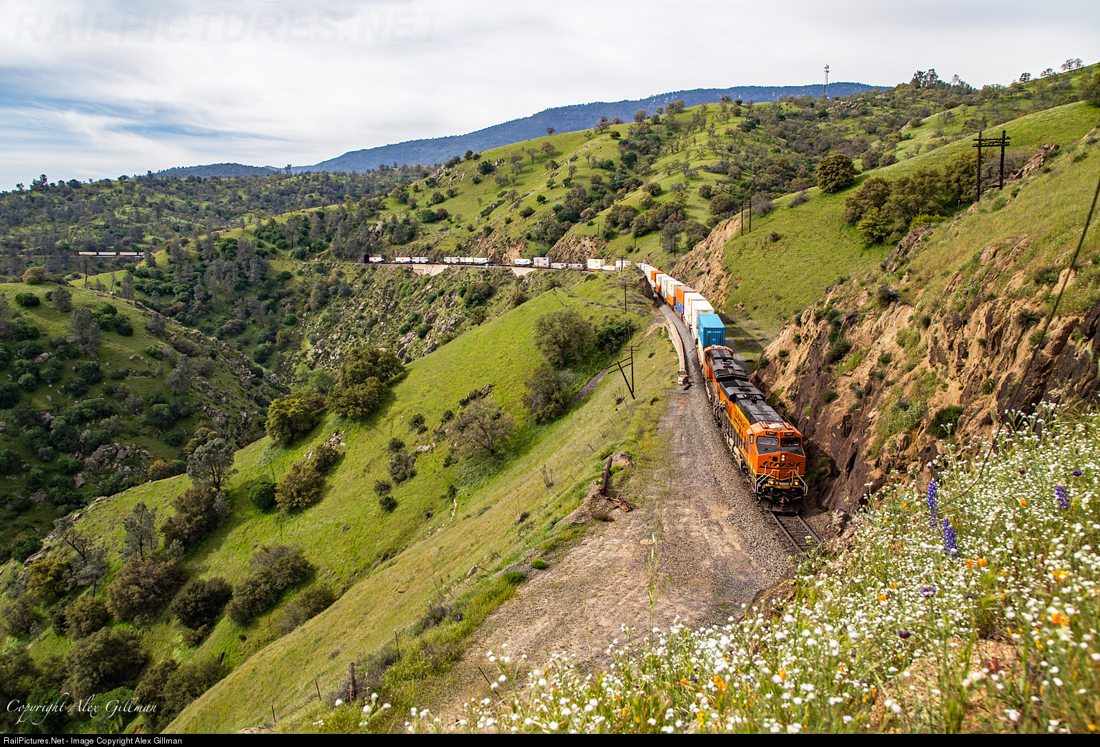 | While not covering the hills in masses like past springs have produced, splashes of color can still be found in the hills of Tehachapi as found here at Cliff. BNSF 7037 is seen breaking the silence as it eases its northbound Z train downgrade. |