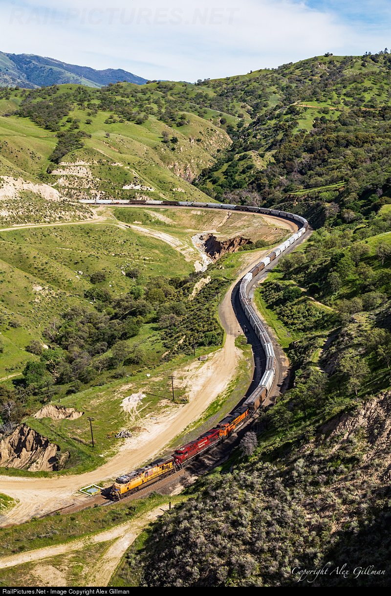A Worm With An Identity Crises. UP 5288 leads a 13,000-ton, loaded grain train carefully down Clear Creek Ravine and past the long abandoned Tunnel 4 on the 5,900-foot long train's decent toward Tunnel 3 and Bealville. Likely the best train of the train captured by our small group, this BNSF SweetGrass, Montana to Modesto, California train had quite the assortment of power not limited to the head-end's UP, CP and BNSF SD70ACe motors. Passing out of this picture to the left up at Cliff, the train's three mid-train, "swing" helpers included another BNSF SD70ACe and a shiny Ferromex ES44AC.