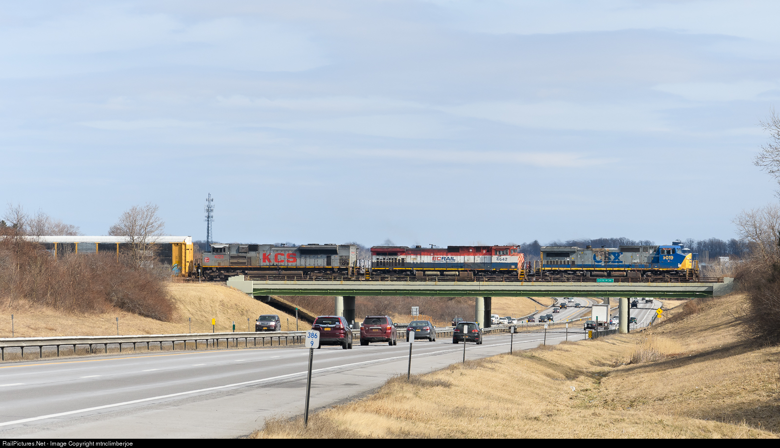 CSX empty autorack train Q261 crosses over the New York State Thruway in Batavia, New York with a unique lashup. A CSX YN2 Dash 9 leads a BC Rail Dash 9 and a KCS gray scheme SD70ACe.