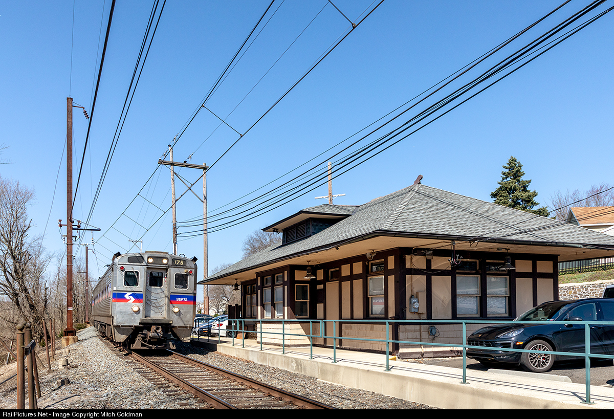 A mid-day northbound SEPTA commuter train passes the "old" 1910 built Reading station (now a law office) in Chalfont, PA. A new station stop built by SEPTA is just behind and features a high level platform and a small glass shelter. The train began its run at Philadelphia's 30th Street Station and is destined for Doylestown, PA via Lansdale on the old Reading Company ROW, today's SEPTA Lansdale/Doylestown branch.