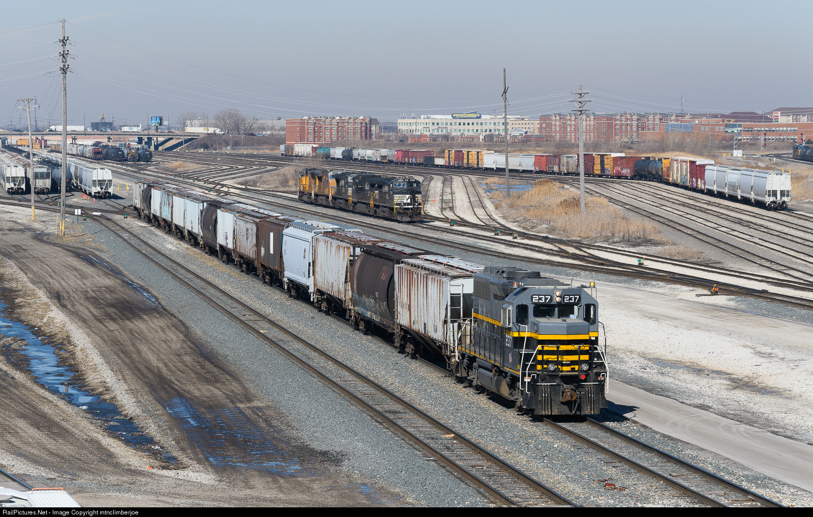 BRC 237 pulls down a cut over covered hoppers as it switches cars at the Belt Railway of Chicago's Clearing Yard. A set of NS power awaits its next assignment in the background.