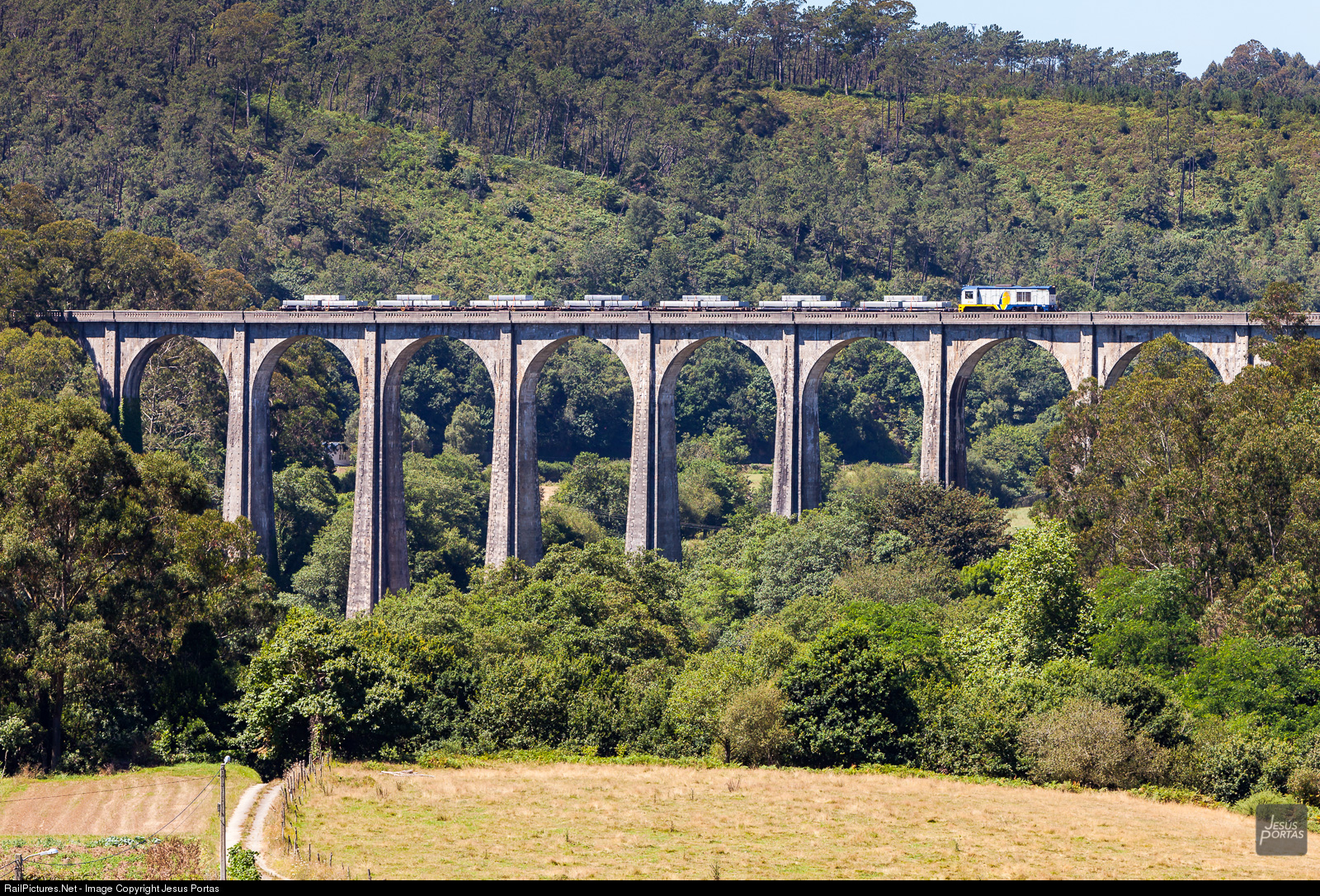Feve 1602 pulling an aluminum train over Canero viaduct.