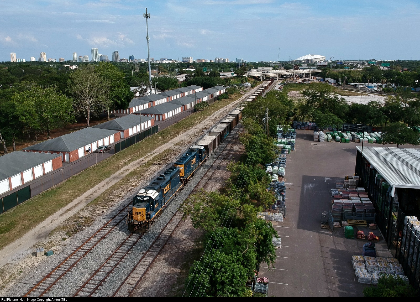 The rarely photographed CSX O701 sits tied down in St Petersburg Yard for the weekend. This train can usually only be seen operating in the late evening hours when it is dark. The drone offers a great vantage point as you can see downtown St Petersburg and Tropicana Field, home of the Tampa Bay Rays baseball team.