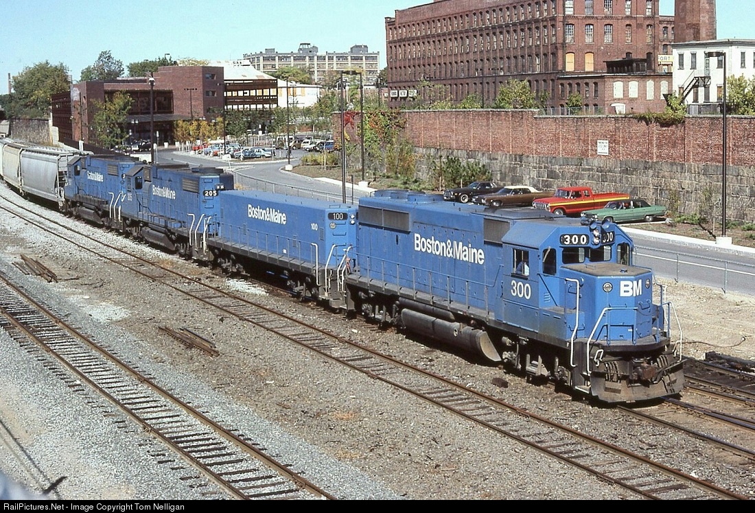 Boston & Maine road slug 100 and parent GP40-2 300 team up with a pair of GP38-2s on train MERU (Mechanicville, NY, to Rumford, ME) at Lowell, MA. The home made slug was built at the B&M's Billerica (MA) shop on the frame of an ex-UP GP9.