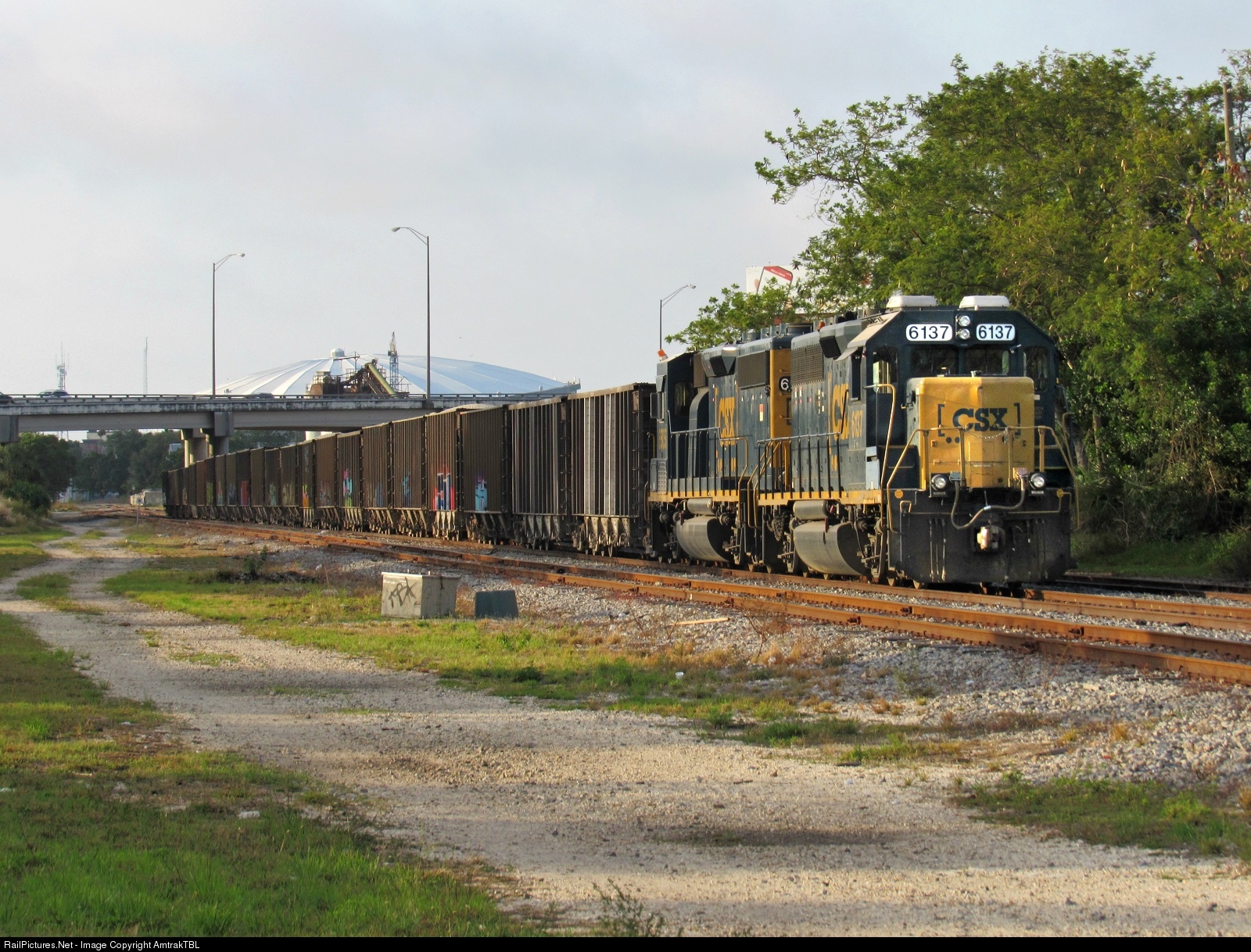 | The rarely photographed CSX O701 rests in the morning sun tied down in St Petersburg Yard for the weekend. The big dome you see in the background is Tropicana Field, home of the Tampa Bay Rays baseball team. |