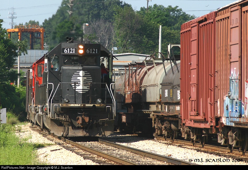 | This northbound empty coal train (C70171 12), with IC 6121 out front, waits as a southbound passes headed for CN Johnston Yard. The intermodal crane for NS Forrest Yard can be seen in the background. |