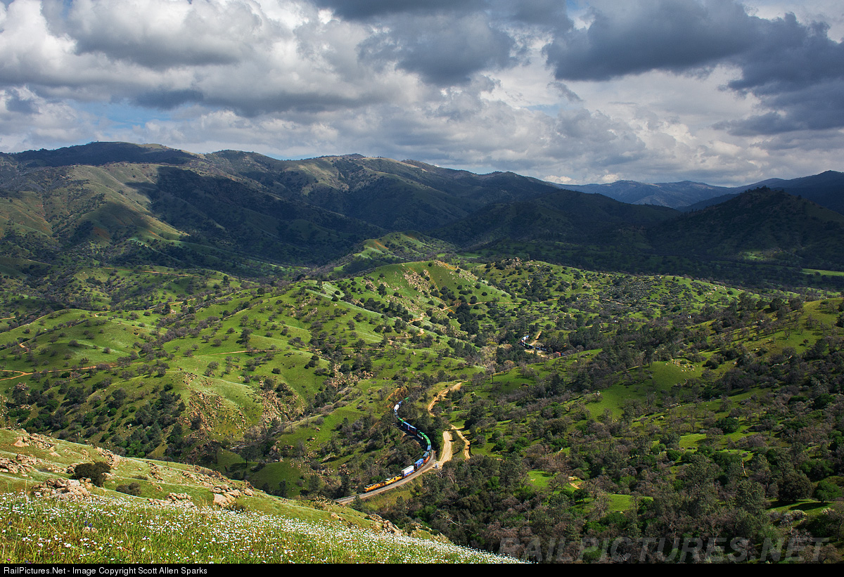 | Proving there’s more to the Tehachapi mountains than just trains, a UP intermodal slowly snakes its way north through the highly vegetated hills and cuts around the secluded area of tunnel 8, while a big afternoon storm continues to brew in the skies above, creating massive shadows across the backdrop. |