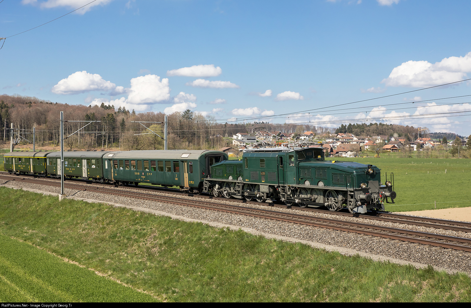 | "Crocodile" Ce 6/8 III # 14305 of SBB Historic, built in 1925 by SLM and MFO, is pulling a passenger train for retired staff of the SBB between Herzogenbuchsee and Riedtwil. The first car is standard type I B # 55 85 20-35 746 of association Mikado 1244 (former Südostbahn car), followed by two lightweight cars B # 5560 and A # 2251 of SBB Historic. |