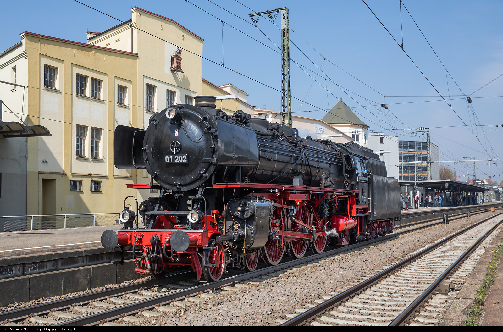 | Former Deutsche Bundesbahn express train steamlocomotive 01 # 202 of association Pacific 01 202 at Lyss/Switzerland, is running around her train at Ludwigsburg, to start the last leg of the journey from Dresden back to Lyss. The 4-6-2 "Pacific" brought the 5 car train from the Kornwestheim shunting yard some minutes ago. |