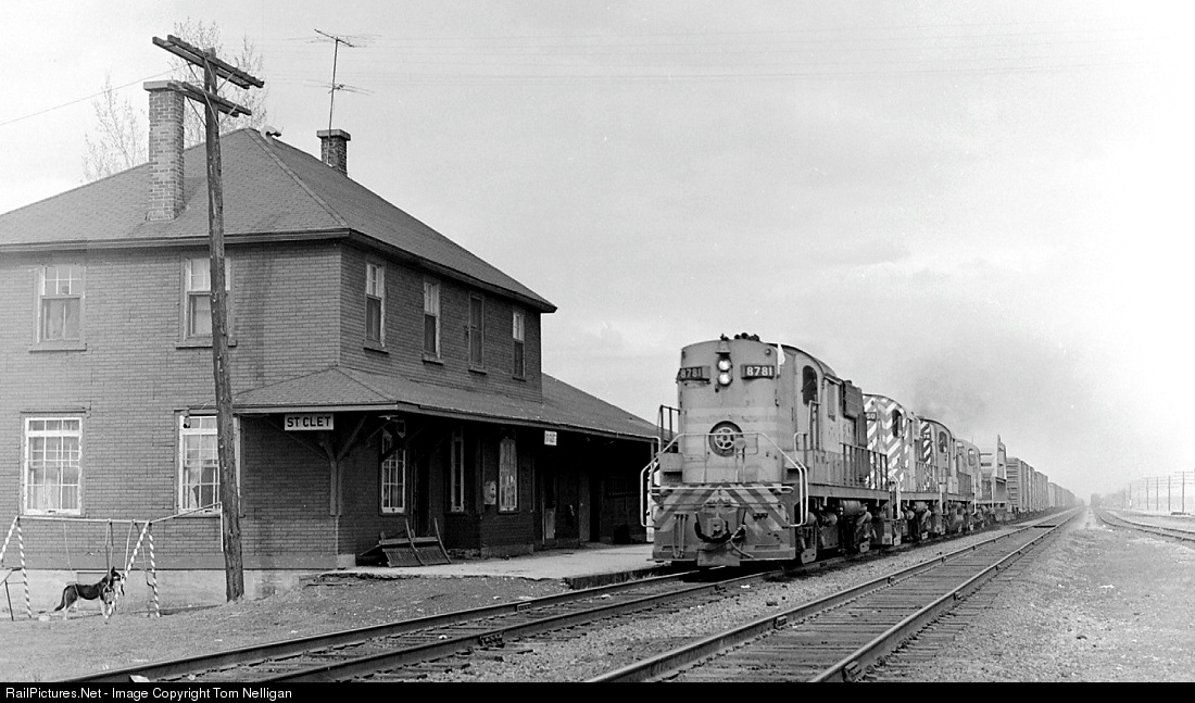 A Canadian Pacific freight behind four-unit MLW lashup consisting of three RS18s and an RS3 rumbles west at St. Clet, Quebec. The substantial station there, like many across the CPR system, doubled as a residence for the agent and his family.