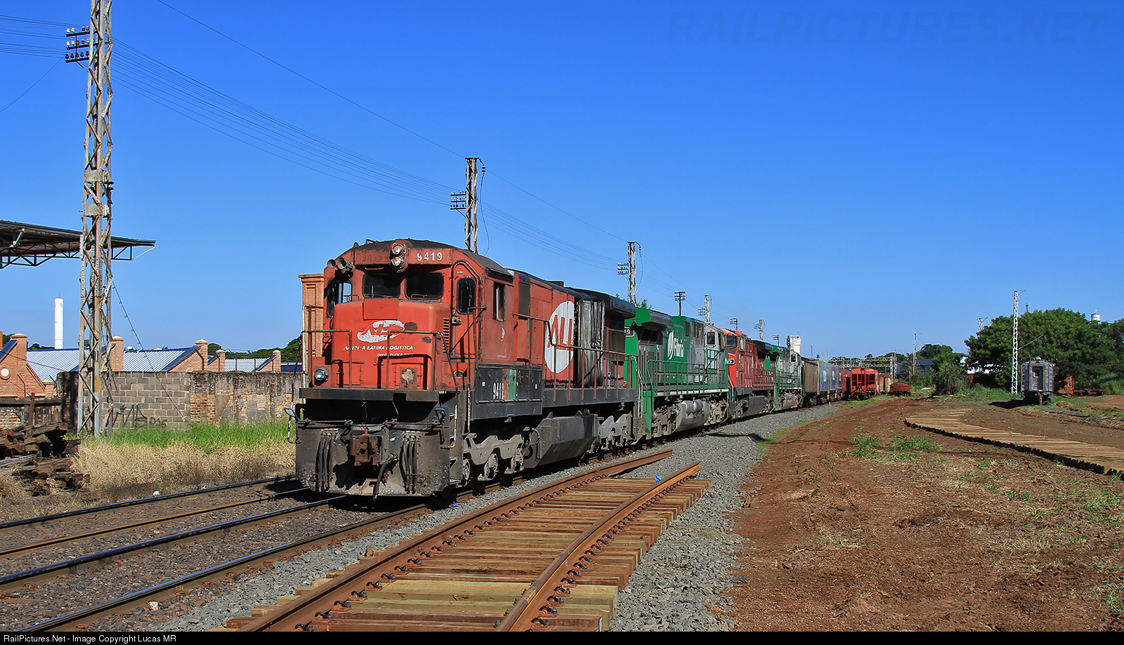 | It is pretty hard to see the old C30-7 locomotives leading trains nowadays. Northbound empty X99 arrives in São Carlos yard track 2 with veteran 9419 leading. The yard is receiving new tracks, due clearance issues. |