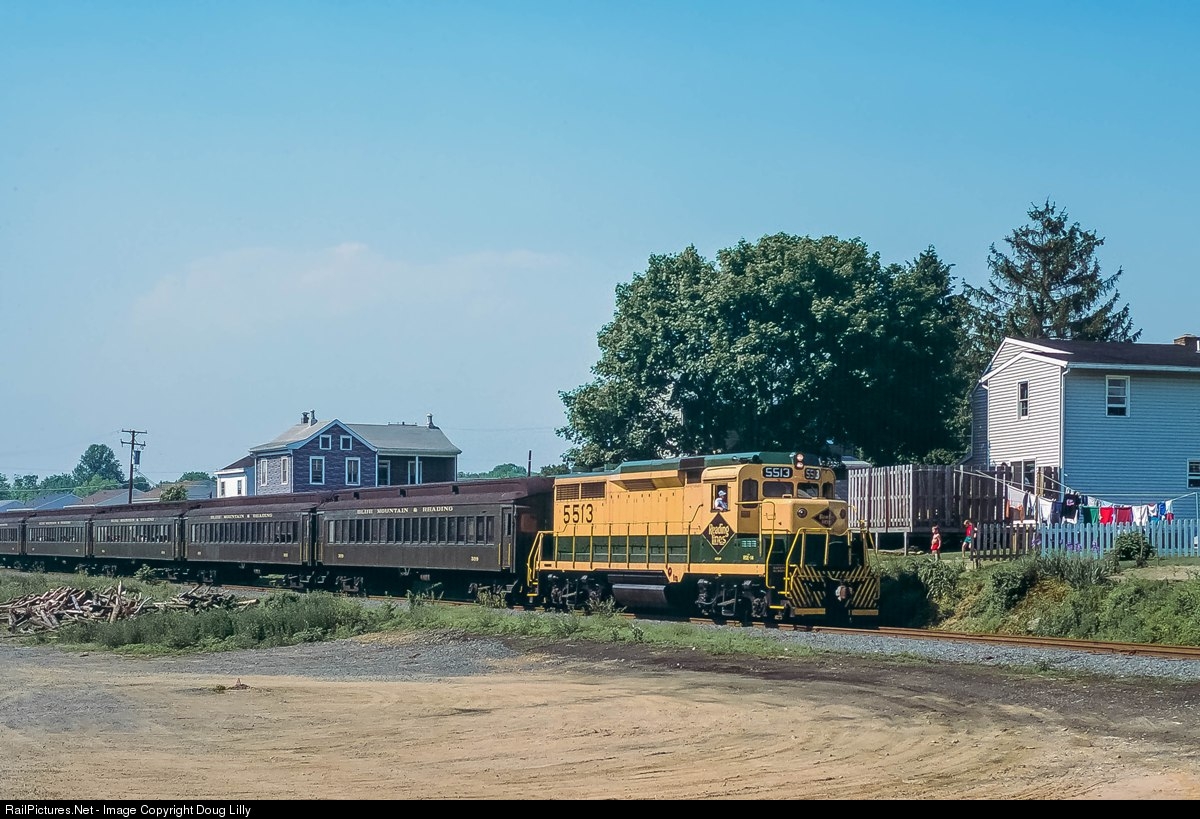 | Restored Reading GP30 5513 is in passenger service on the Blue Mountain and Reading, running south through Shoemakersville, Pennsylvania. |
