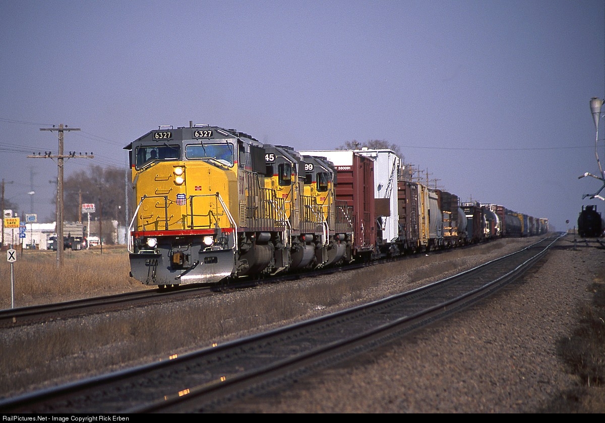 The daily North Platte-West Colton manifest comes rip roaring through the one (flashing) traffic light town of Brule, NE on an early spring afternoon. The space between the mainlines was once occupied by one of the frequent center sidings that allowed lower priority traffic in either direction to dodge the high class, back in the olden days of current of traffic railroading. Fuji Velvia.