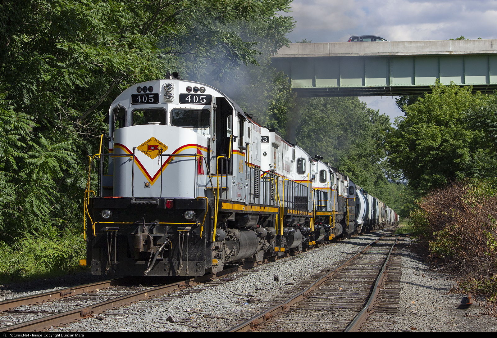 DL road local PT-97 starts west from the interchange at Portland where it had just swapped cars with NS H-76. C420 #405 leads the way back towards Scranton.