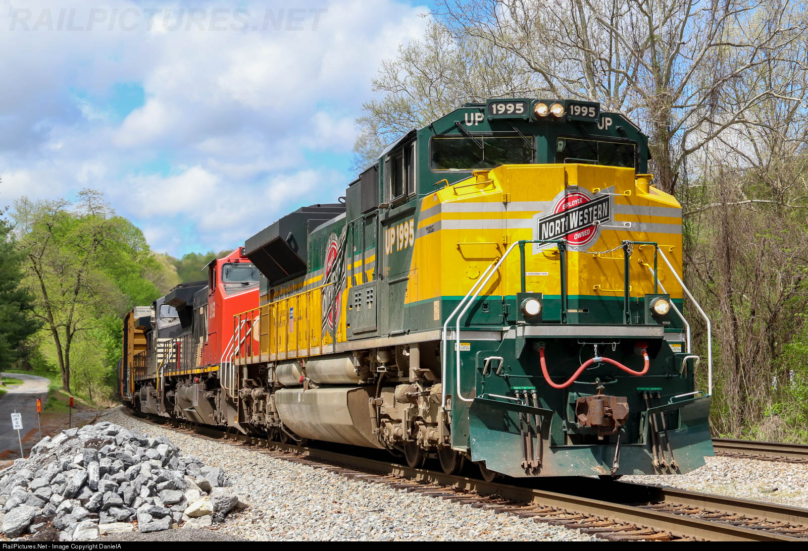 | NS 188 rumbles eastbound through Villamont, Va. on the Blueridge District with a rare treat leading the way. UP 1995, the Chicago and Northwestern heritage unit finds itself off of UP rails on the east coast. |