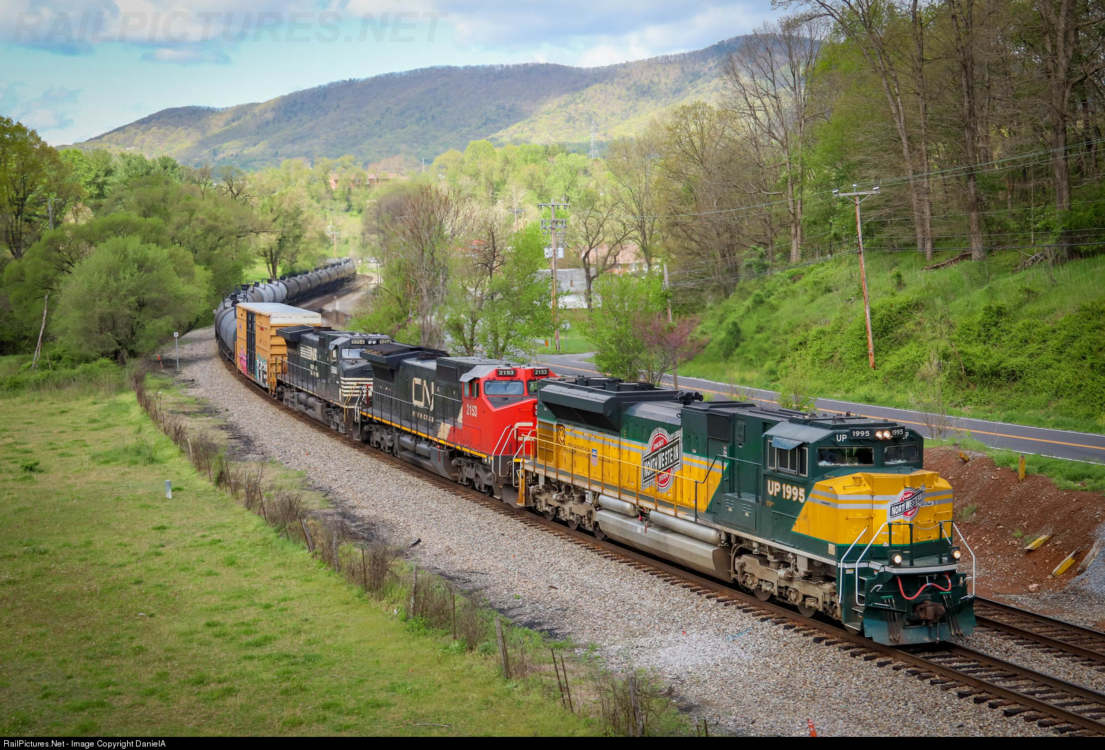 | The Union Pacific heritage unit of the Chicago and Northwestern Railroad leads NS 188 eastbound through Webster, Va as it prepares to duck under the Blue Ridge Parkway bridge. |