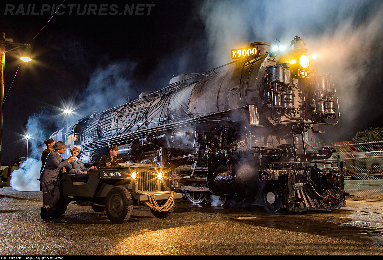 "This here is one of our finest," said the UP Manager. In a staged scene part of the annual night photography session at the Rail Giants Train Museum in Pomona, a Union Pacific executive points out the features of one of his company's most powerful steam locomotives, the UP 9000, to a pair of enlisted men and their female companion who have briefly stopped by the breathing giant in their WWII-era Jeep.