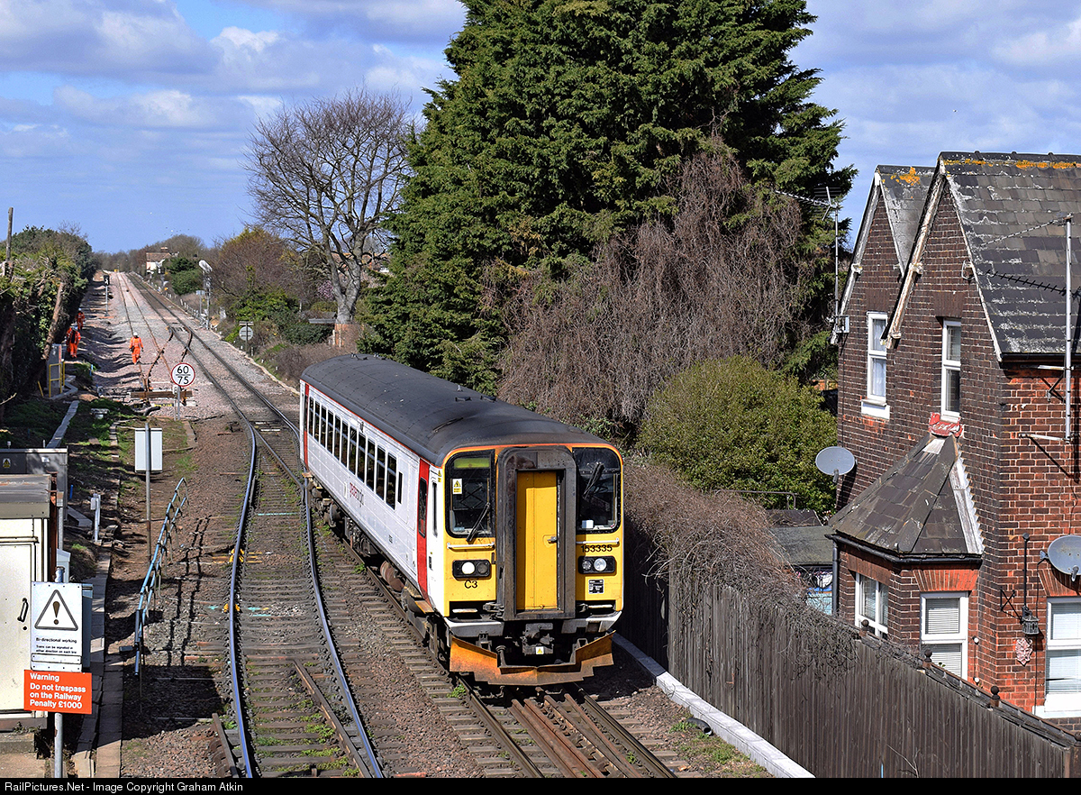 The 10.58 passenger service from Ipswich to Felixstowe approaches Trimley station. Incredibly, the branch line from Ipswich to the UK's most important container port at Felixstowe is still largely single track. However, as can be seen, work is now in progress to extend the spur from the port's North terminal, on the left in the photo, to increase capacity and enable more freights to run.