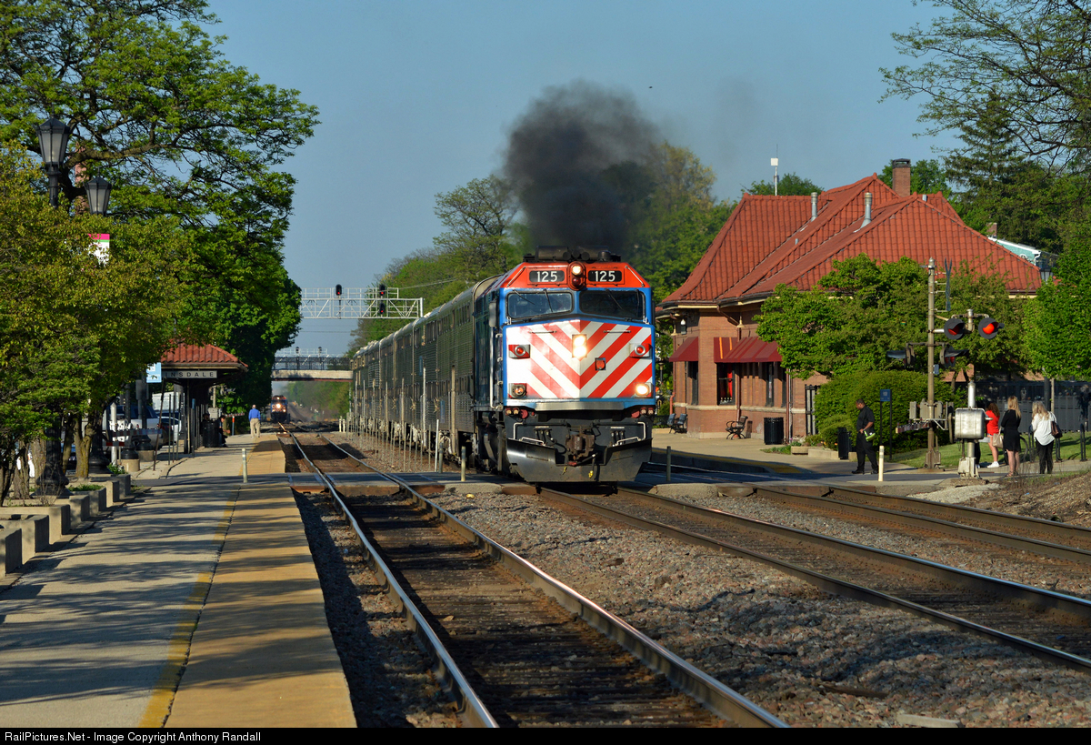 | Veteran F40PH 125 throws out a cloud of smoke as it cruises though Hinsdale with train 1277. In the background, train 1275 is slowing for a station stop. |
