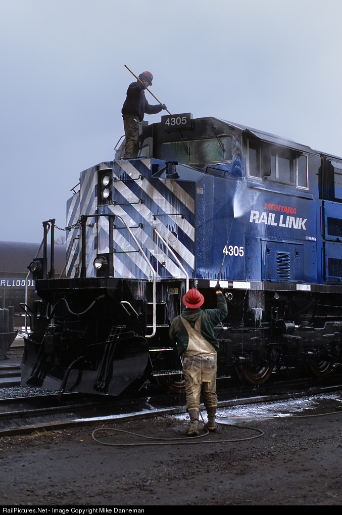 Montana Rail Link EMD SD70ACe locomotives used in helper service over Mullan Pass accumulated a ton of grime and soot working through confining Mullan Tunnel under the Continental Divide. MRL washed these units on a nearly daily basis, as this crew from R&R Mobile Services does on brand-new No. 4305 at Helena, Montana, on October 8, 2005. Just how fast these helper sets got dirty can be seen on one coming through Austin led by No. 4305 three days before after only one trip through Mullan Tunnel!