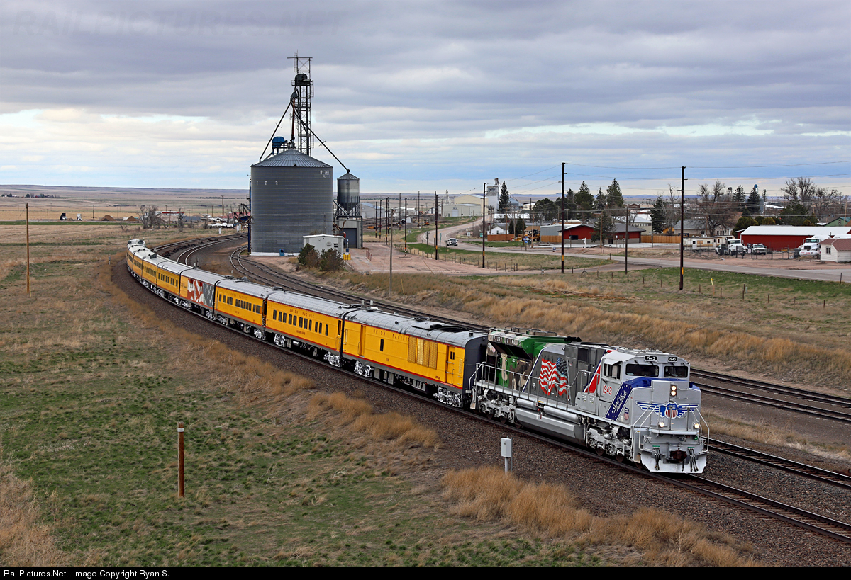 With ten pieces of Union Pacific's first class varnish in tow and Union Pacific's 'Military Spirit' locomotive leading the charge a westbound passenger special sails through Pine Bluffs, WY having just crossed the Nebraska-Wyoming state line.