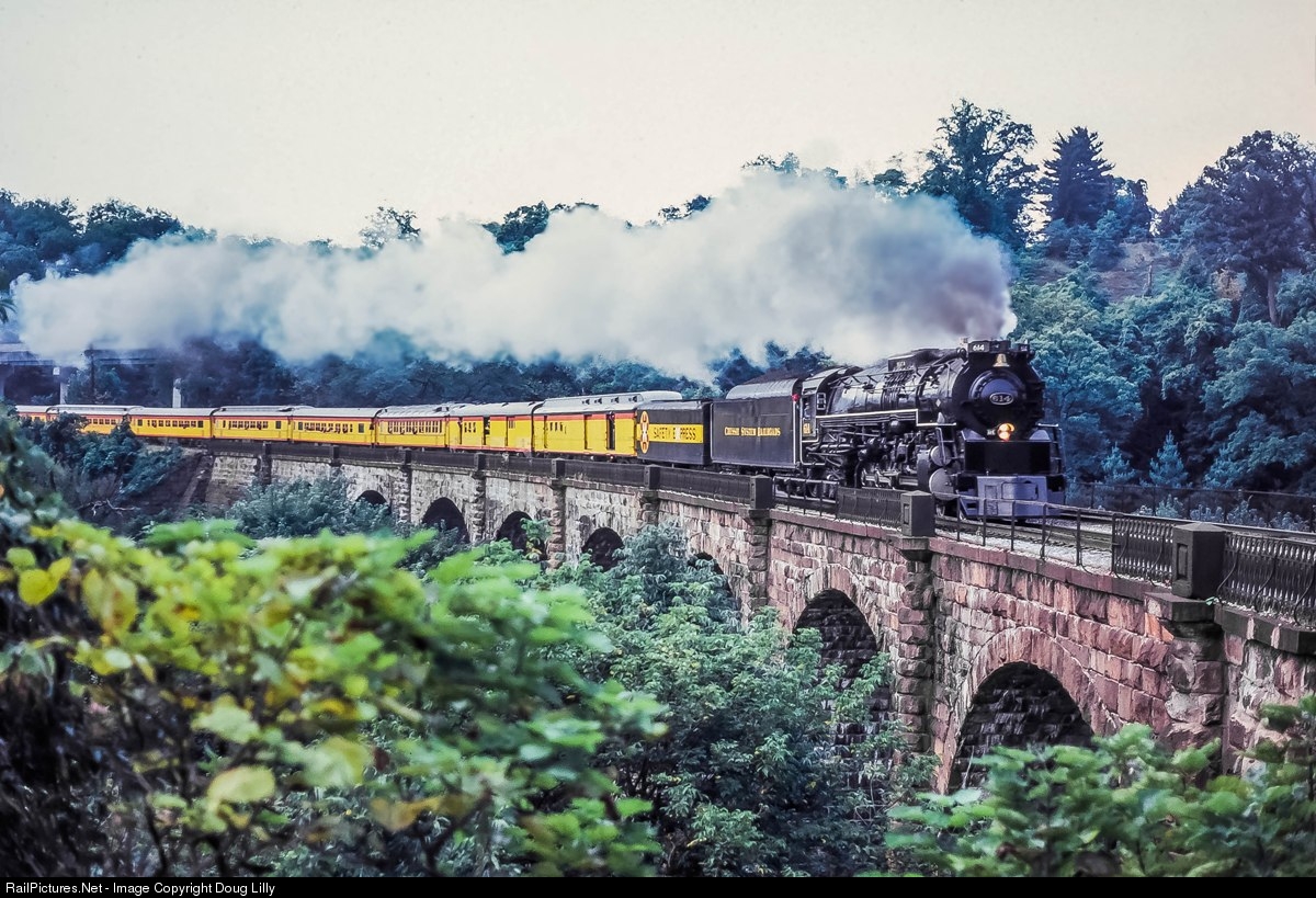 Philadelphia bound, C&O 4-8-4 614 leads the Chessie Safety Express over the Thomas Viaduct at Relay, Maryland. The round trip, operated by the Baltimore Chapter of the NRHS, originated in Silver Spring, Maryland.