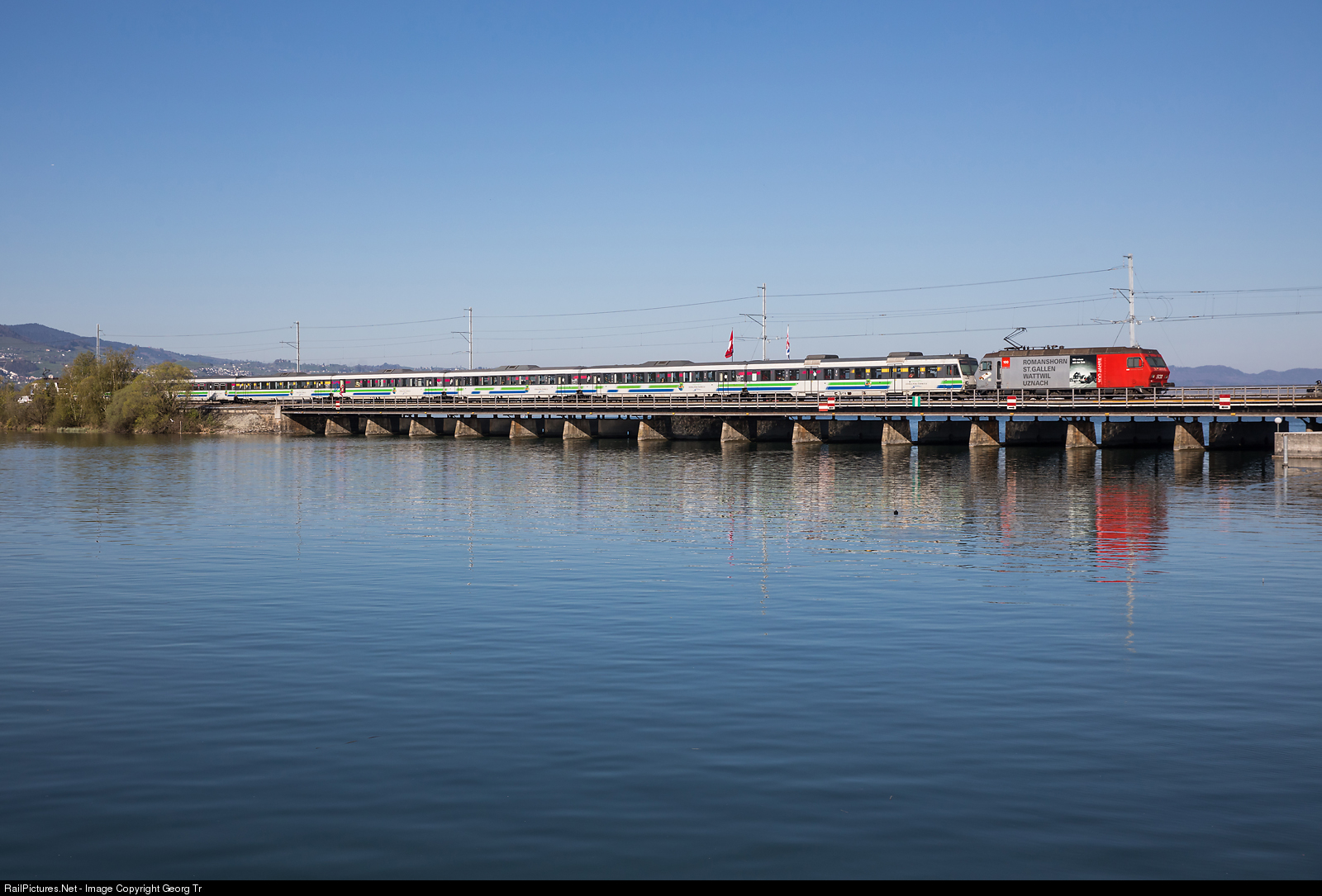 | Re 456 # 095 of the Südostbahn (SOB) in publicity paint scheme for "100 years railway line Romanshorn-St.Gallen-Wattwil-Uznach 1910 to 2010" is shoving the Voralpen-Express VAE 2566 from St.Gallen to Lucerne over the lake dam/bridge between Rapperswil and Pfäffikon SZ. In front of the push-pull train is Re 456 # 094 "VÖGELE SHOES". |