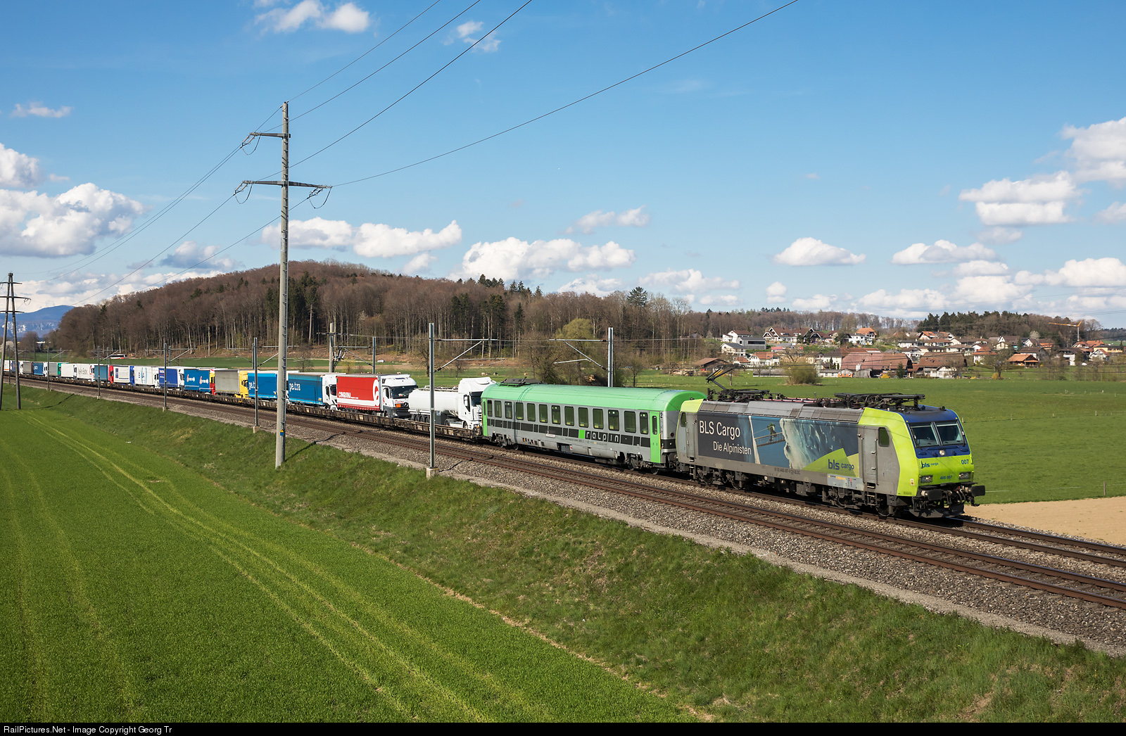 | Re 485 # 007 of BLS Cargo is pulling the southbound "Rolling Highway" train 43625 of the "RAalpin" company (Share holders of RAlpin are BLS AG, Hupac SA, SBB Cargo AG and Trenitalia SpA.) from Freiburg im Breisgau freight terminal/Germany to Novara Boschetto/Italy near Bollodingen between Herzogenbuchsee and Riedtwil. |