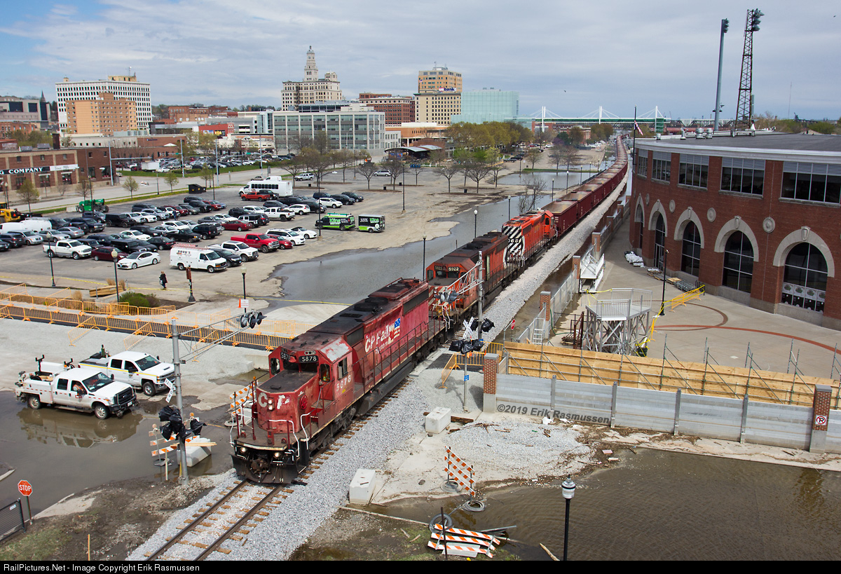 A trio of veteran Canadian Pacific SD40-2's bring a 60 car Herzog ballast train through downtown Davenport. This view shows how the CP has elevated the mainline at least 2 feet over the Gaines Street crossing to combat flood waters. A new pedestrian path was created to access Modern Woodman Park and a new road approach will be constructed after the Mississippi River stops flooding.