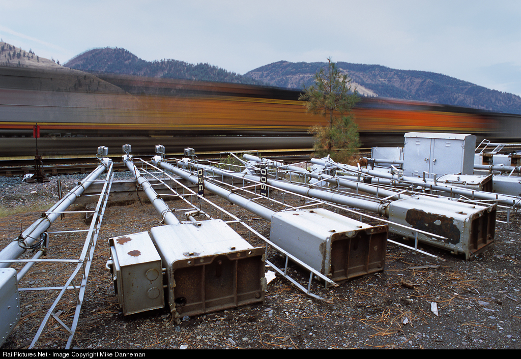 A westbound Burlington Northern Santa Fe coal train blurs past a graveyard of semaphore signal masts lined up at Superior, Montana, after their removal from usefulness on October 6, 2005. One of our favorite sets was at milepost 192 on Montana Rail Link’s Fourth Subdivision east of St. Regis (two middle signals, 192.0 and 192.1).
