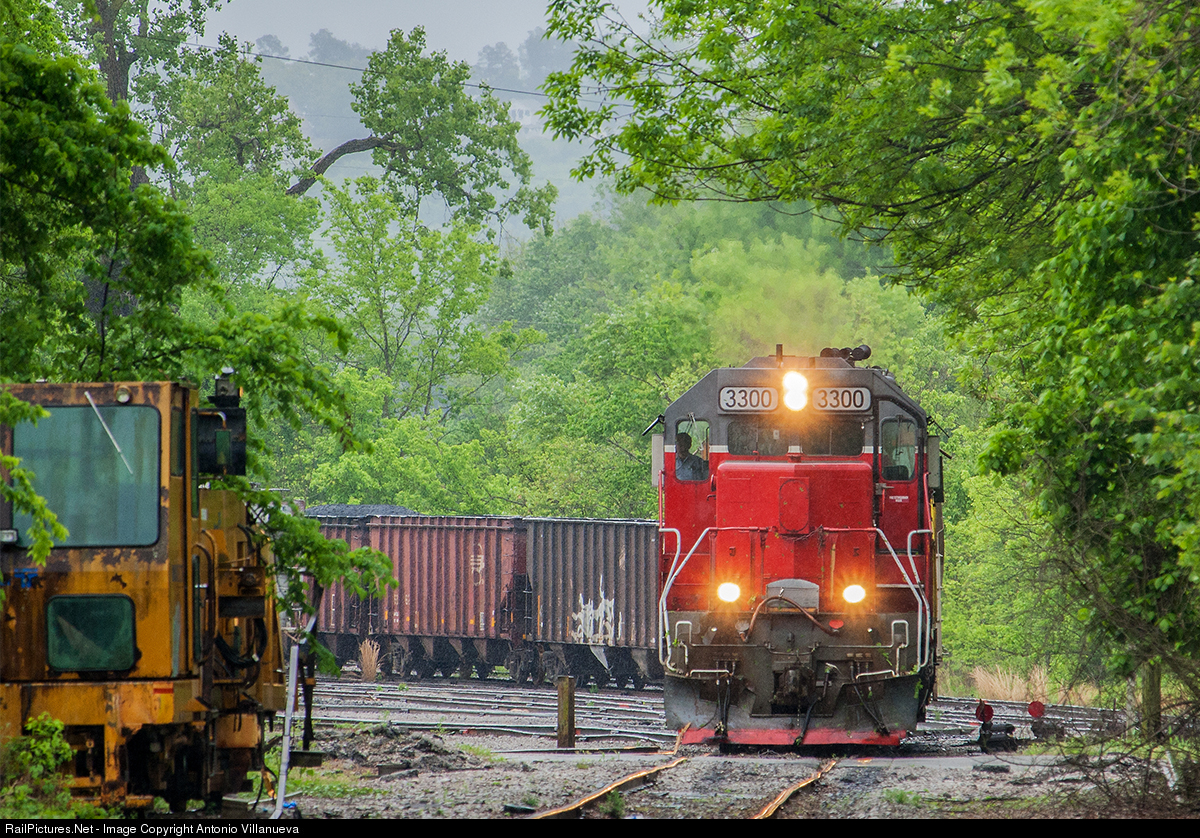 | After leaving it's train on the mainline, MNA 3300 shoves on the branch leading to the yard, where it'll tie down. Evidence of an earlier incident where the train hit a downed tree can be seen with the green leaves on the plow. |