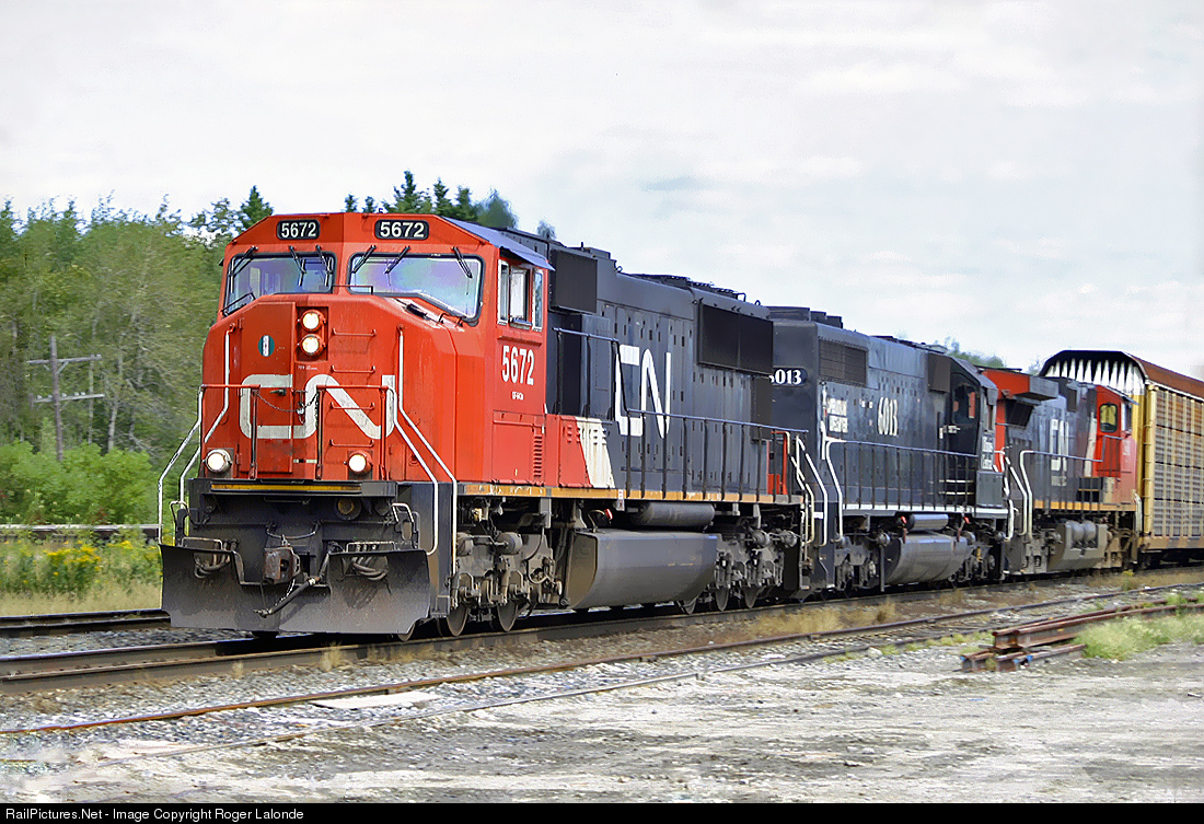 | CN SD75I 5672 with Illinois Central SD40A 6013, and CN C44-9W 2617 heading west at Grand Falls, New Brunswick. |