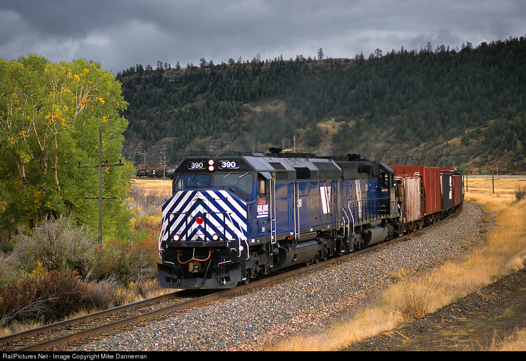 Montana Rail Link EMD F45 No. 390 leads LM (Laurel to Missoula manifest freight) approaching Greycliff, Montana, on the afternoon of October 3, 2005. The train will be treading through snow by the end of of the day during a blue hour climb of Bozeman Pass.