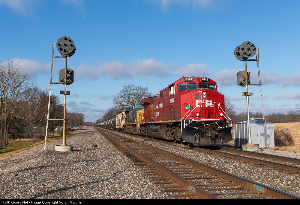 Eastbound crude oil train 66X with a freshly rebuilt CP AC leading has just finished out its climb up Wooster Hill and is now drifting downgrade into Orrville, Ohio, splitting the Pennsy intermediates at Back Orrville Road, PC126 on the NS Fort Wayne Line. These intermediates are the approach signals for CP ORR, about two miles to the east where the line goes back to single track. CP ORR is the last location with Pennsy signals that this train will pass on this section of the Fort Wayne Line as all interlockings and intermediates between there and Alliance have been replaced.
